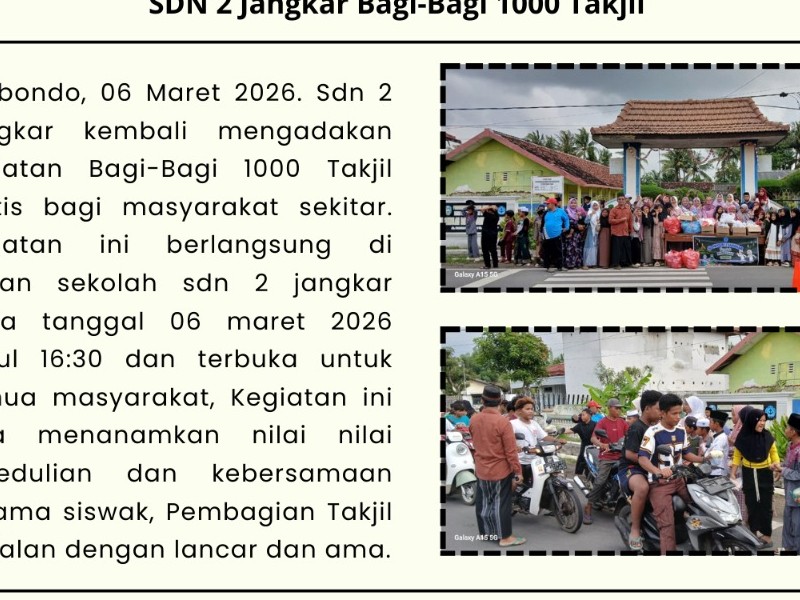 SD Negeri 2 Jangkar mengadakan kegiatan berbagi 1000 takjil bagi masyarakat sekitar pada tanggal 06 Maret 2026. Kegiatan ini berlangsung di depan SD Negeri 2 Jangkar pada pukul 16.30 WIB dan terbuka untuk semua masyarakat. Kegiatan ini juga menanamkan nilai-nilai kepedulian dan kebersamaan sesama siswa. Pembagian takjil berjalan dengan lancar dan aman.
